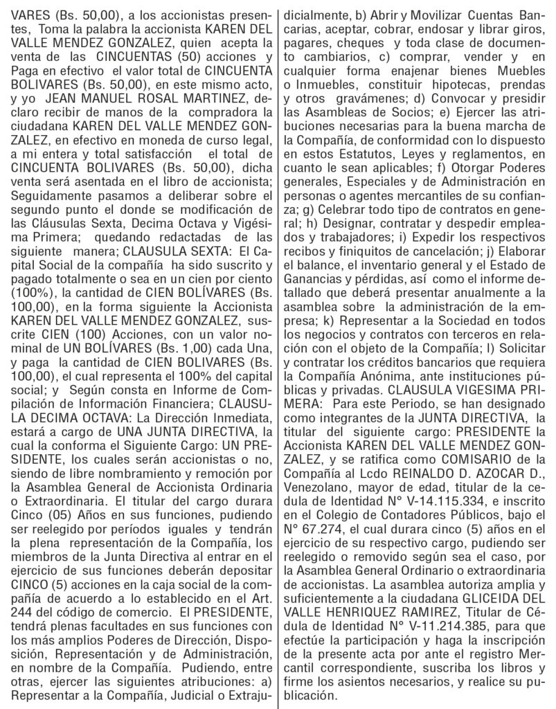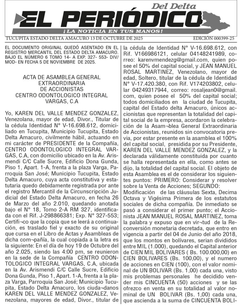 PUBLICACIONESActa de asamblea general extraordinaria de accionistas Centro Odontológico Integral Vargas, C.A. Mercedes Marín5 meses atrás01 minutos Navegación de entradas Anterior: Cronicas (im)pertinentes: Giro copernituosoSiguiente: Cartel único de notificación Deja una respuesta Cancelar la respuestaTu dirección de correo electrónico no será publicada. Los campos obligatorios están marcados con *Comentario * Nombre * Correo electrónico * Web Guarda mi nombre, correo electrónico y web en este navegador para la próxima vez que comente. Δ
